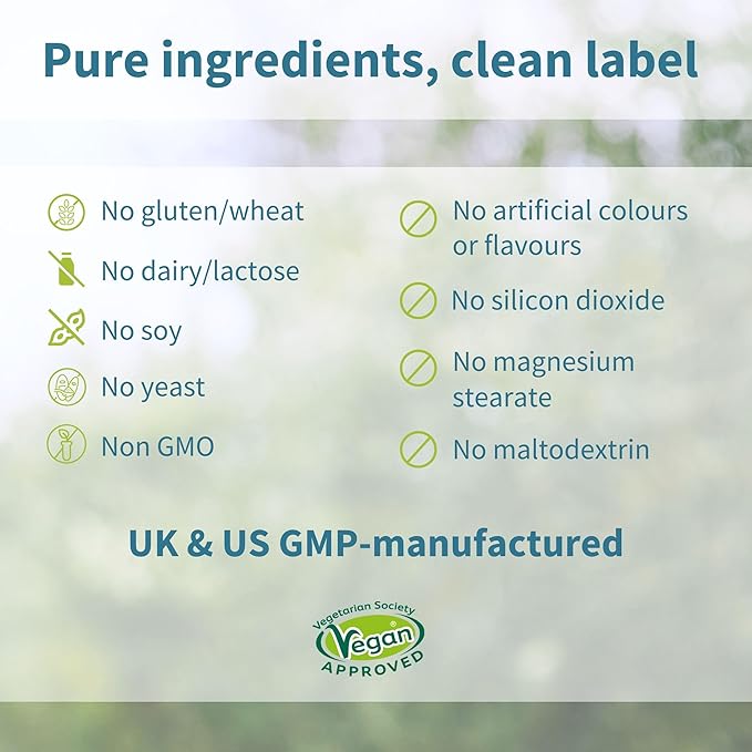 - PURE, NON-ACIDIC & GENTLE ON THE GUT: natural plant lipids boost absorption without irritating the gut. Free from magnesium stearate, silicon dioxide, gluten, dairy, lactose & soya. GMP-manufactured. Vegan