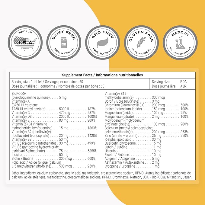 - 🔬 CONTAIN: BioPQQ, Vitamin A, B1, B2, B3, B5, B6, B12, C, D3, E, Biotin, Folic acid, Boron, Chromium, Iodine, Magnesium, Manganese, Molybdenum, Selenium, Zinc, Inositol, Alpha R lipoic acid, Quercetin phytosome, Lutein, Ubiquinol, Fisetin, Apigenin, Astaxanthin, Lycopene | Other ingredients : calcium carbonate, stearic acid, maltodextrin, croscarmellose sodium, HPMC.