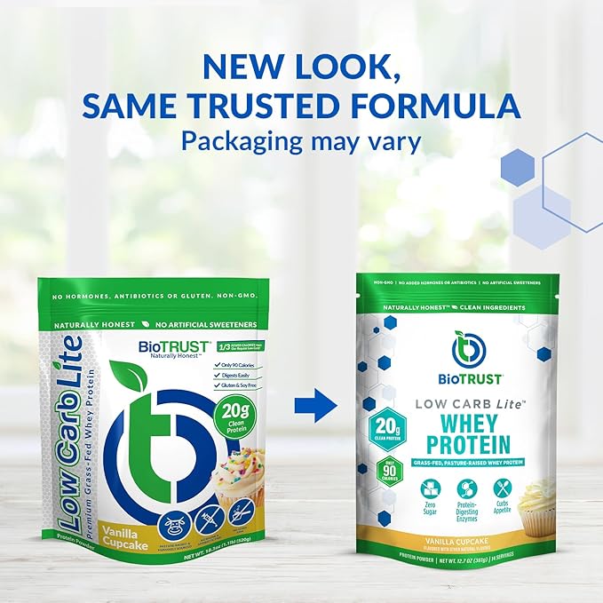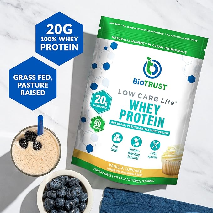 BioTrust Low Carb Lite, 20 Grams of Grass-Fed Whey Protein Isolate, 100 Calories, ProHydrolase Digestive Enzymes, Non-GMO, Free from Soy and Gluten, rBGH-Free (14 Servings) (Vanilla Cupcake)