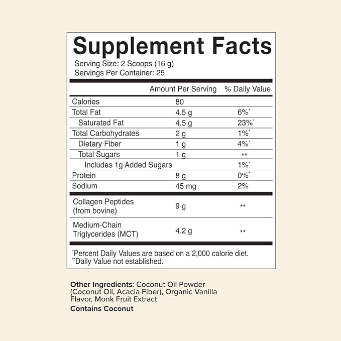 - KETO COLLAGEN: Combined with MCTs from coconut powder and organic vanilla, this non-dairy creamer alternative provides a nutritious and delicious coffee creamer or smoothie alternative.