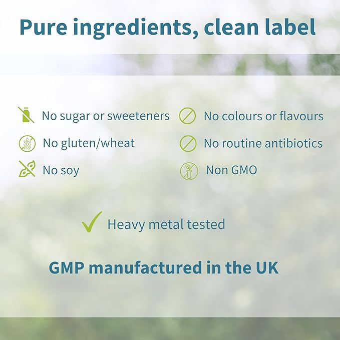- UK GMP MANUFACTURED. Free from gluten, dairy, lactose, soya, wheat, artificial colors & flavors; non-GMO; kosher. Paleo & keto-compatible. 100% recyclable packaging