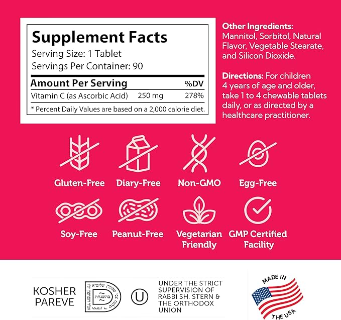 - VITAMIN C BOOSTER - Each delicious Vitamin C chewable tablet contains 250mg of Vitamin C. This essential vitamin helps support the immune system. It also supports collagen production, collagen is essential to the muscles, joints and blood vessels of growing kids.