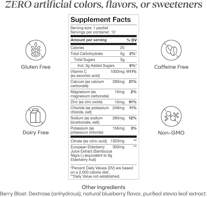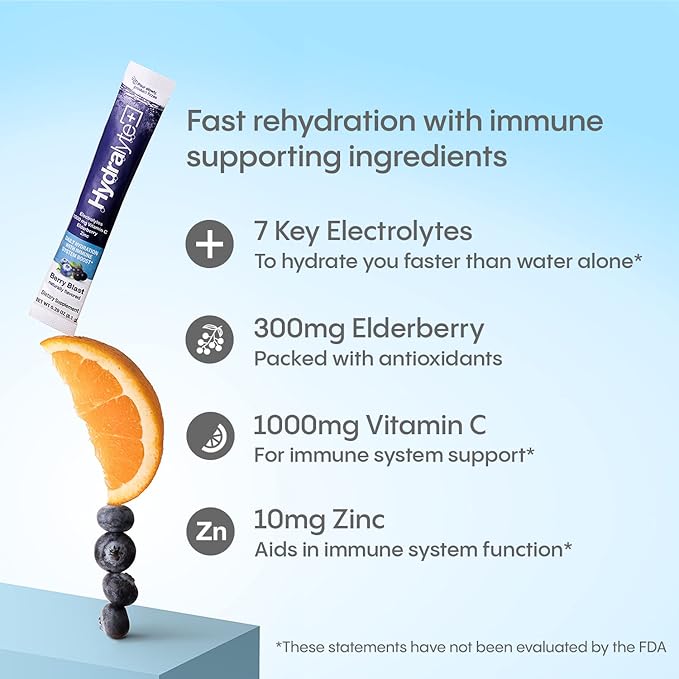 Hydralyte Electrolytes Plus Immunity, Elderberry - Low Sugar Rapid Rehydration Powder - Lightly Sparkling Electrolyte Powder Packets with 1,000mg Vitamin C and 300 mg Elderberry (8oz Serve, 12 Count)