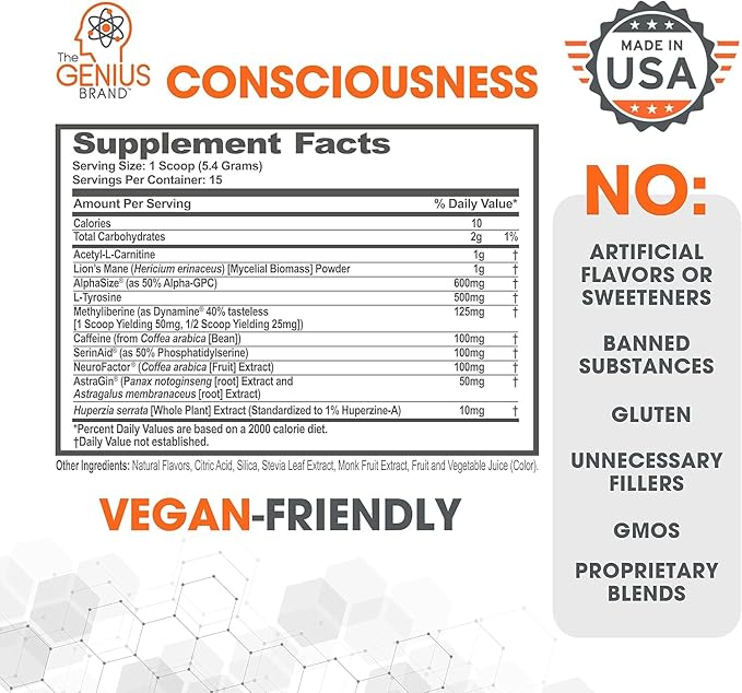 - Awaken Your Mind: Genius Consciousness by The Genius Brand brings together strong, natural brain-enhancing ingredients in one great-tasting daily drink for high-performance thinking.* Formulated to help support improved memory, concentration, learning, recall, mood, and focus.* Mango flavor. 15 scoops per container.