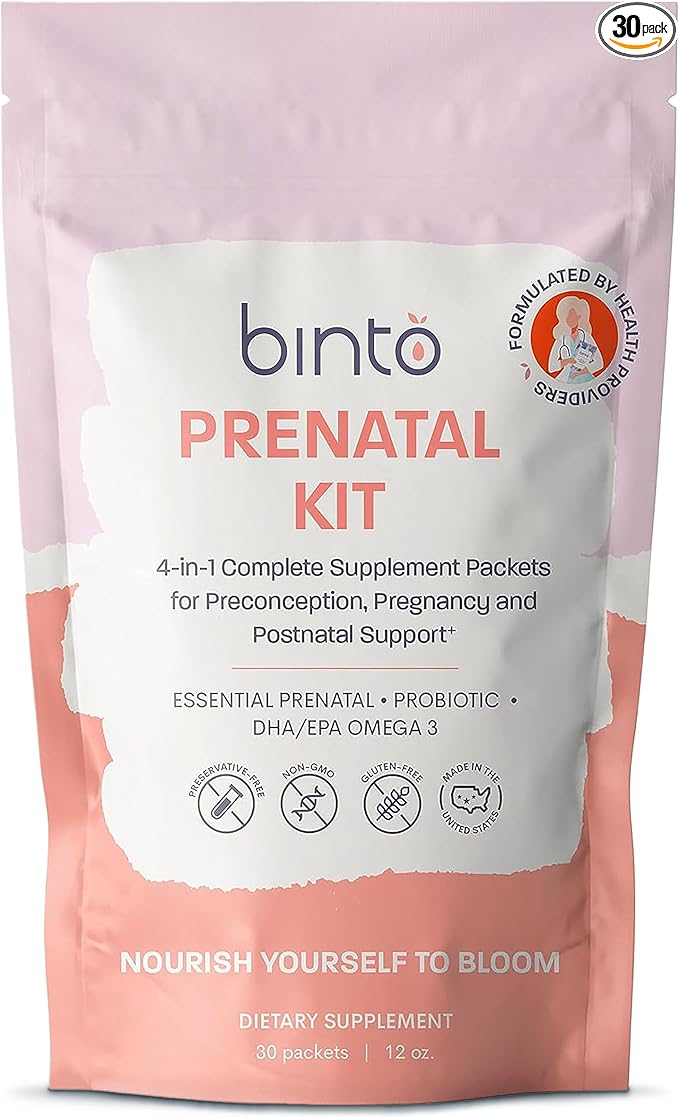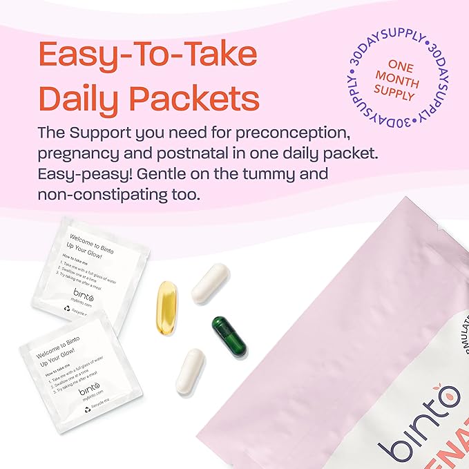 - CONVENIENT PACKAGING FOR DAILY DOSING: Binto's daily packet provides holistic prenatal support with essential plant-based omega-3 DHA/EPA, vitamins including vitamin D3, iodine, and choline, and a blend of prebiotics/probiotics to promote balanced gut and vaginal biomes. Each daily pack comes with the pre portioned prenatal supplements ready-to-go and perfect for travelling.