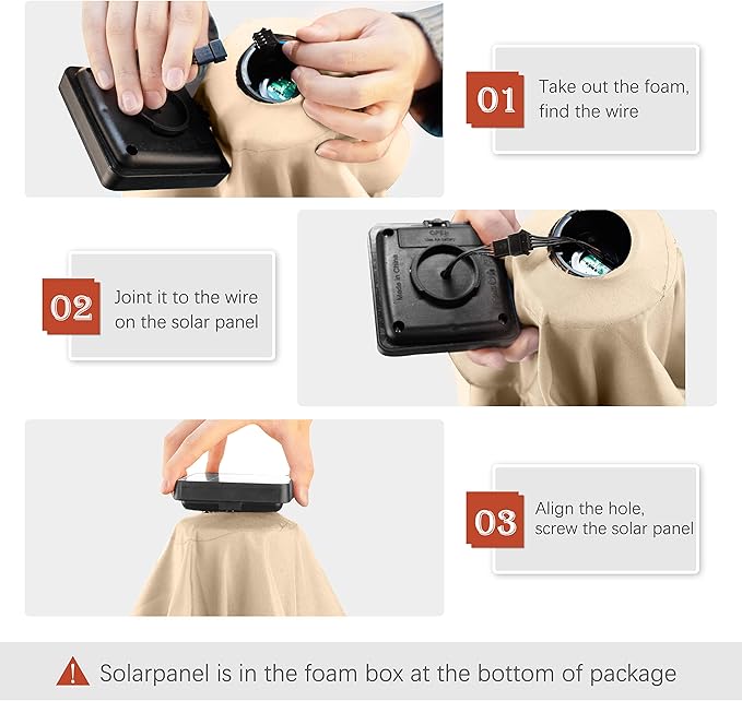 - Note --- SOLAR PANEL is in the FOAM BOX at the TOP of the package. With product inspection, the products are always upgrading. If there is any question please contact us, you will get the response within 24 hours. Weight is not included, please search "FRUITEAM" for a compatible umbrella weights