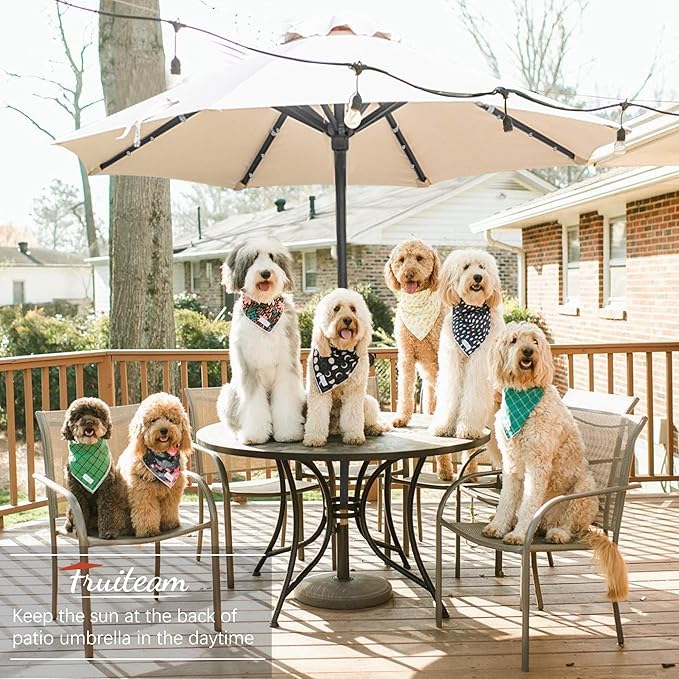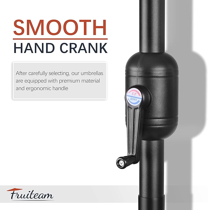 - MULTI-FUNCTIONAL, EASY OPERATION --- FRUITEAM Outdoor umbrella is equipped with 3-position dura-tilt mechanism, ensuring you adjust the angle of table umbrella easily according to the sun direction. Smooth crank mechanism make it easy to open and close. Vented canopy help wind and heat ventilation, make umbrella remain stable and grounded