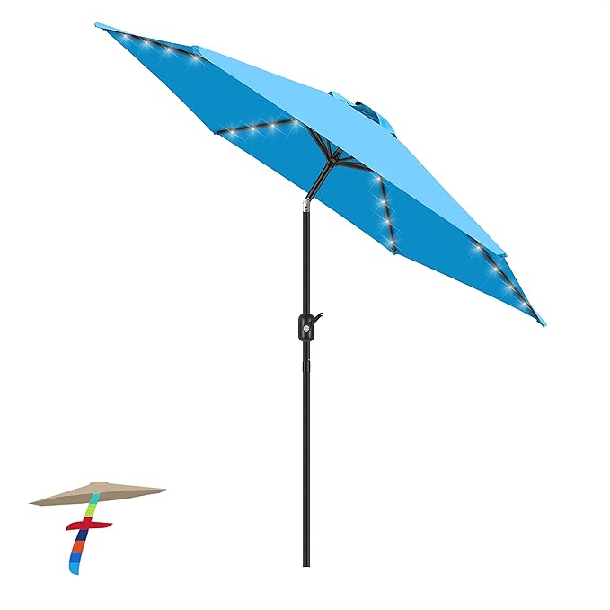 FRUITEAM 7 1/2 ft Solar LED Umbrella Solar Powered Umbrella Polyester LED Lighted Patio Umbrella w/Tilt Adjustment and Fade-Resistant Fabric - Sky Blue