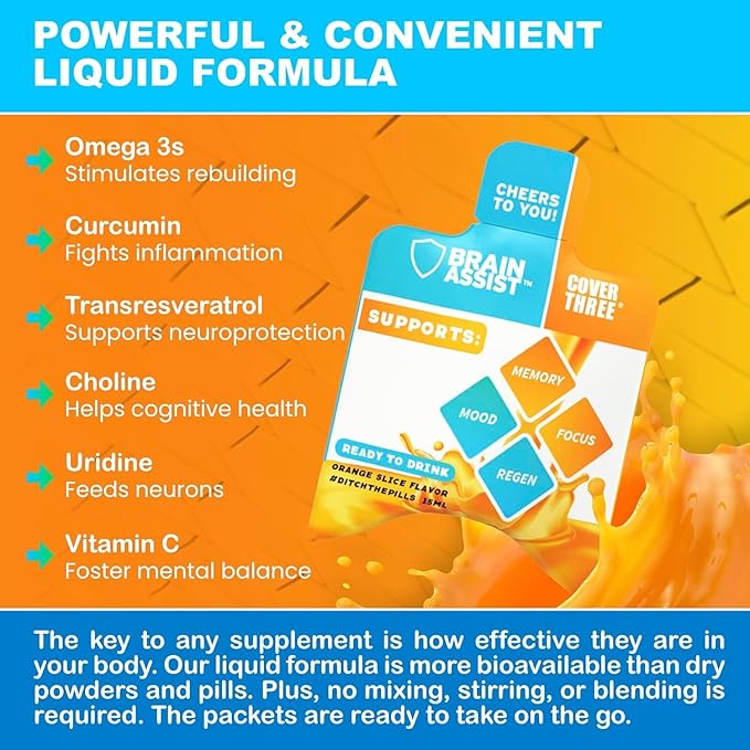 Cover Three Brain Assist Brain Supplement, Nutritional Focus Supplement with Curcumin, Uridine, Orange Slice Liquid Brain Support Formula, High Performance Memory Supplements (6 Boxes)