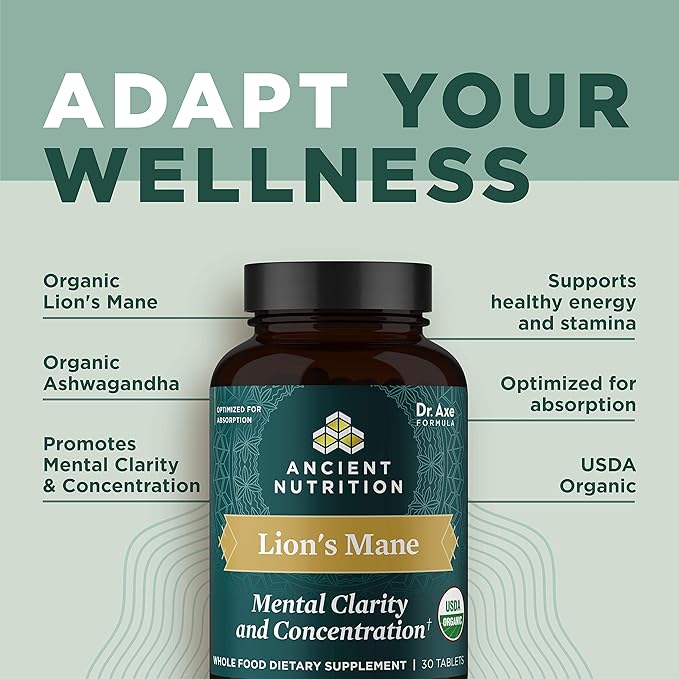 Ancient Nutrition Organic Lion's Mane Mushroom Supplement with Ashwagandha, Organic Lion's Mane Supports Healthy Energy and Concentration, Reduces Fatigue, Gluten Free and Keto Friendly, 30 Tablets