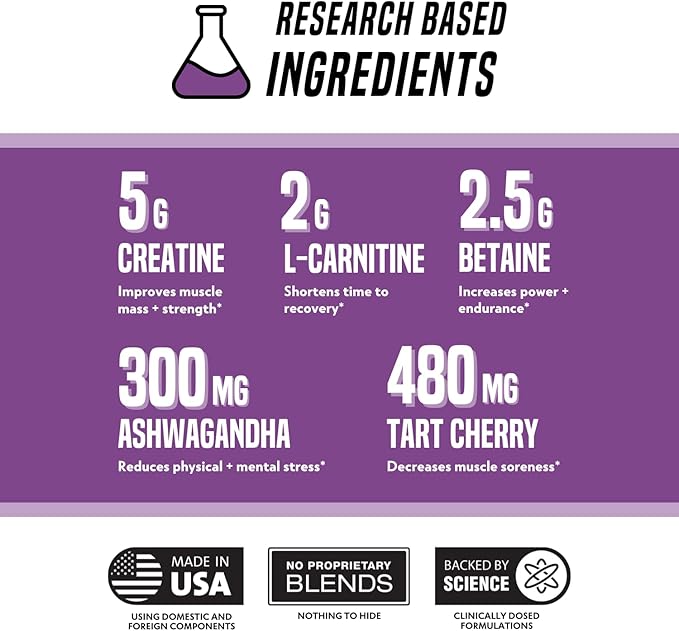 - Backed By Science: Our deliciously flavored post-workout powder for men and women contains ingredients backed by peer-reviewed scientific research at the proper dose to maximize your muscle recovery, including Creatine Monohydrate, Betaine, Tart Cherry Powder, and L-Carnitine