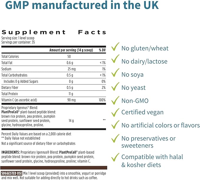 - TRUE PLANT-BASED ALTERNATIVE TO COLLAGEN: the unique PlantProColl peptide blend, enriched with the 3 main collagen amino acids hydroxyproline, proline and glycine, mirrors the nutritional profile of collagen