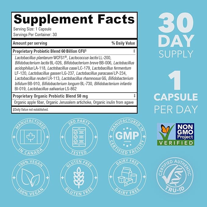 - PROBIOTICS FOR DIGESTIVE HEALTH: Experience the strength of 15 clinically-backed probiotic strains with 60 billion active cultures, plus three organic prebiotic fibers, all designed to support your Gut wellness. Our probiotics supports restoration of healthy gut flora naturally and ease occasional gas, bloating, and digestive discomfort.