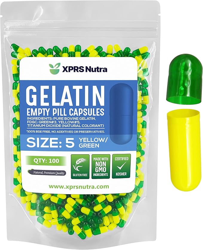 XPRS Nutra Size 5 Empty Capsules - 100 Count Very Small Empty Gelatin Capsules - Empty Pill Capsules for DIY Capsule Filling - Fillable Pill Capsules Empty Gel Caps (Green/Yellow)