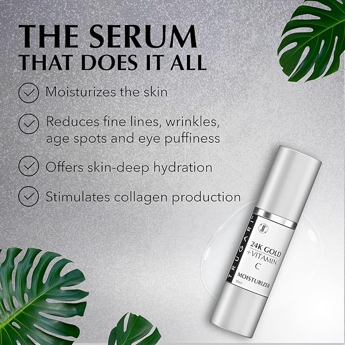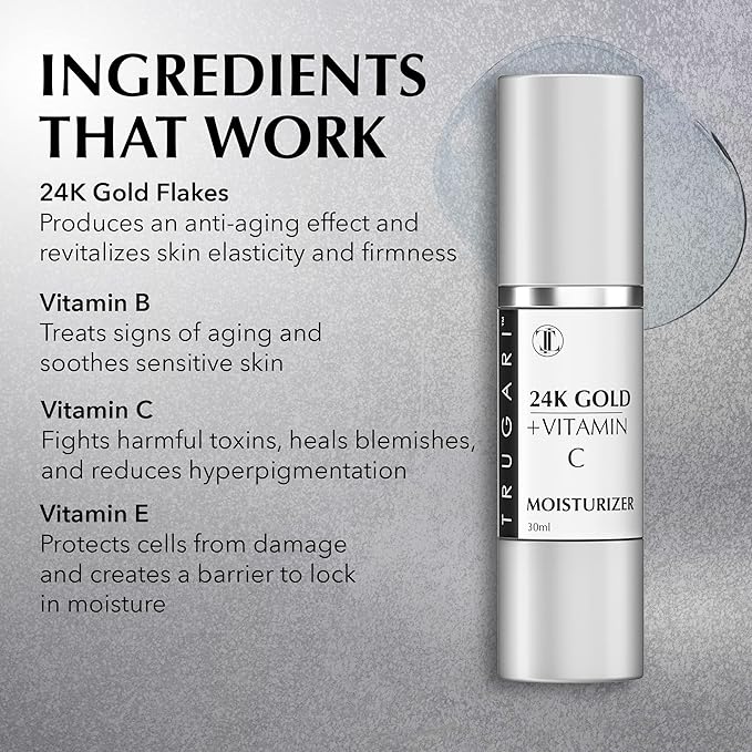 - Stimulates Collagen Production - Experience the face care benefits of 24K gold essence with Trugari’s advanced face moisturizer. With the potent blend of vitamins C, B, E and 24K gold flakes, our facial serum works deeply to reveal a firmer and radiant skin.