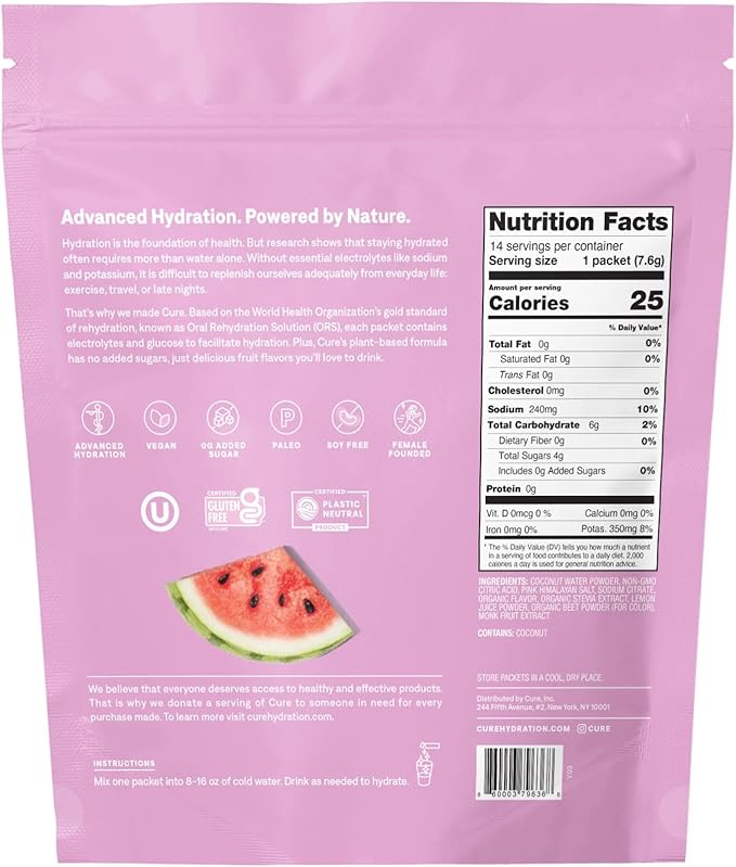 Cure Hydration | Plant-Based Electrolyte Drink Mix | No Added Sugar | FSA & HSA | Dehydration Relief Powder Made with Coconut Water | Non-GMO | Vegan | Pouch of 14 Packets - Waternelon