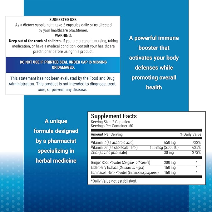 - ✔️ POWERFUL IMMUNE BOOSTER: a blend of Black Elderberry, Echinacea, Ginger Root, Vitamin C, Vitamin D3 and Zinc Picolinate.