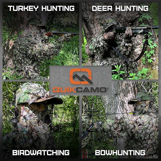 - CAMO WHEN YOU NEED IT - Premium 3D leafy camoflauge clothing for men and women. Whether your hunting turkey, deer, birdwatching, wildlife photography, QuikCamo has you covered. In an instant, your camo hunting hat now has a hunting face cover