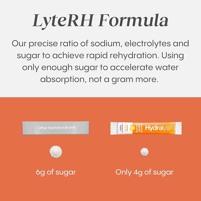- LyteRH FORMULA: Our rapid rehydration formula uses a precise amount of water, electrolytes and a dash of sugar. An exact sugar (glucose) to electrolyte ratio that accelerates fluid absorption. However, unlike sports drinks, we use the optimal amount of sugar, not a gram more.