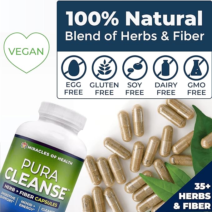 Pura Cleanse Fiber Caps | 100% Natural Herb and Fiber Detox Capsules | Month Supply