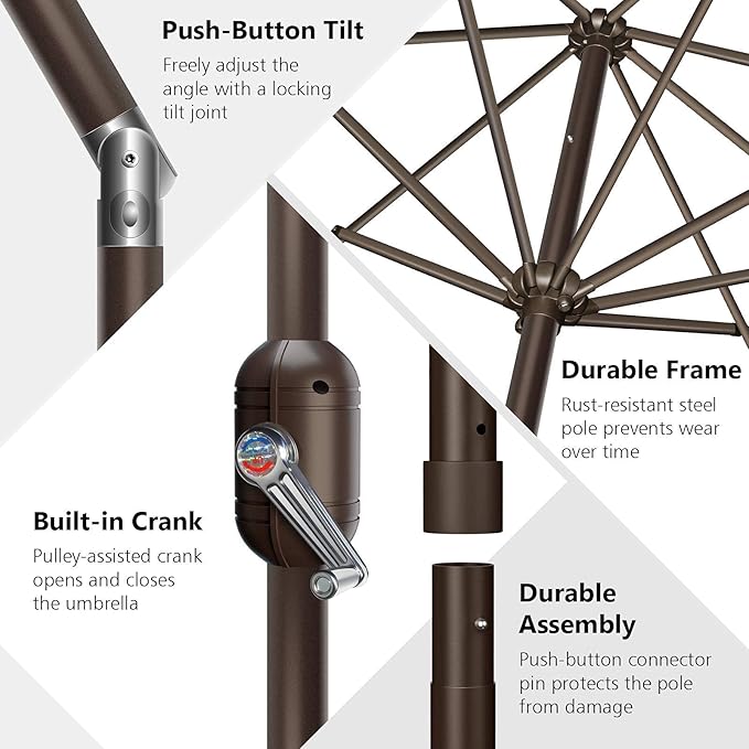 - ⛱️ CRANK, TILT&VENTED DESIGN - Crank mechanism allows to easily open and close the umbrella shade. This tilt patio umbrella features an adjustable shade tilt for optimal shade coverage. The canopy is vented to allow airflow and to give the umbrella more cooling and stability, giving it more wind resistance.