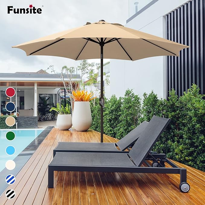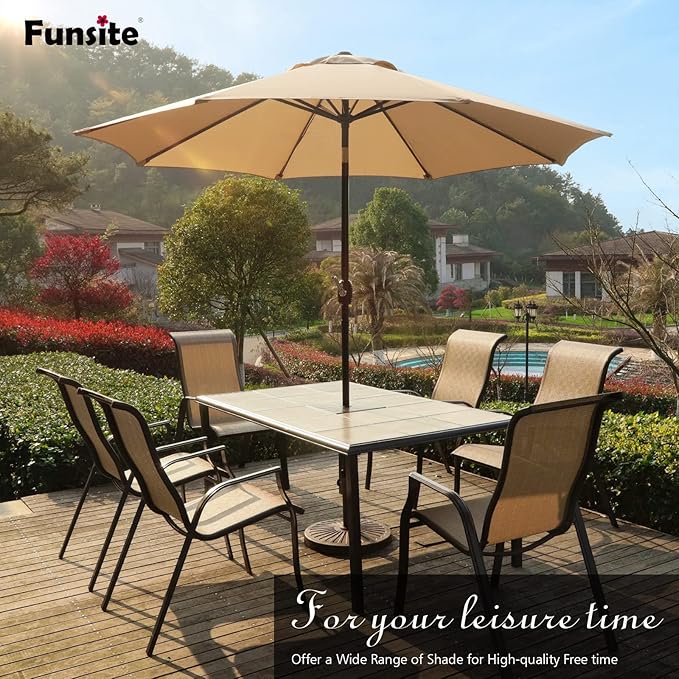 - ⛱️ 9' CANOPY - This patio table umbrella shades your 42" to 54" round, square or rectangle table with 4-6 chairs. It is perfect for spaces like a backyard or pool. Add a splash of color to your outdoor space with the Funsite 9' vibrant tan outdoor umbrella. It sets the tone for enjoying summer days outside with friends and family.