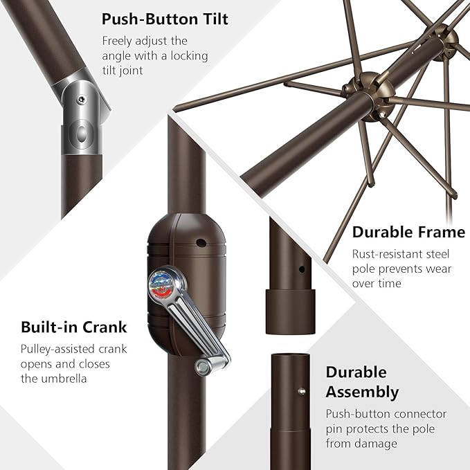 - ⛱️ CRANK, TILT&VENTED DESIGN - Crank mechanism allows to easily open and close the umbrella shade. This tilt patio umbrella features an adjustable shade tilt for optimal shade coverage. The canopy is vented to allow airflow and to give the umbrella more cooling and stability, giving it more wind resistance.