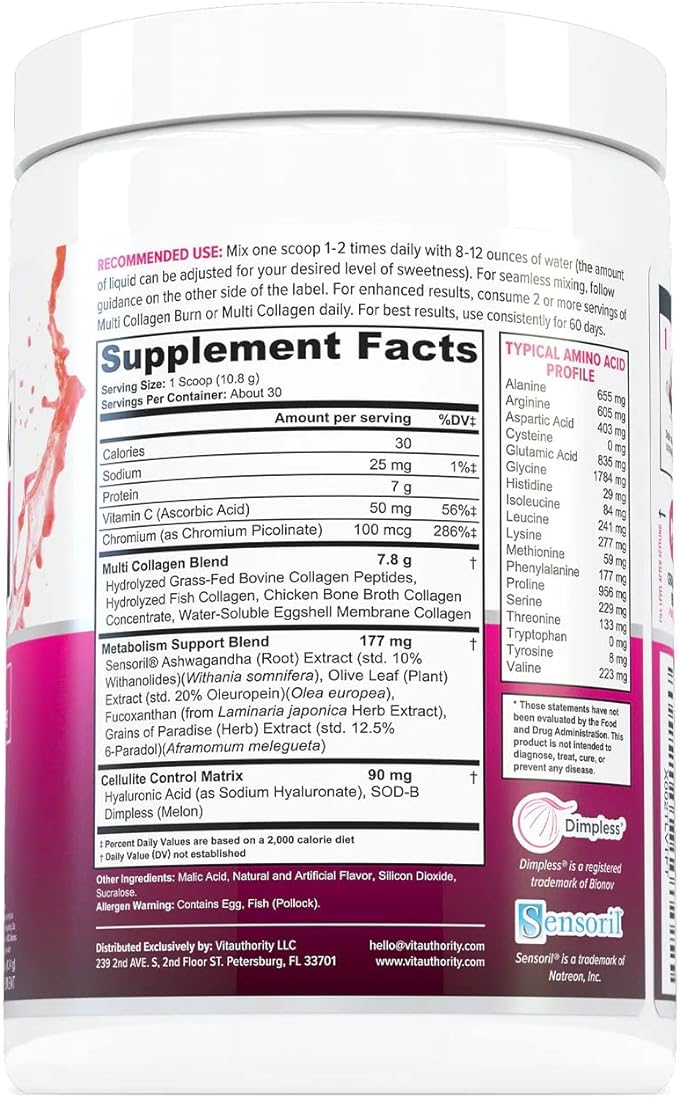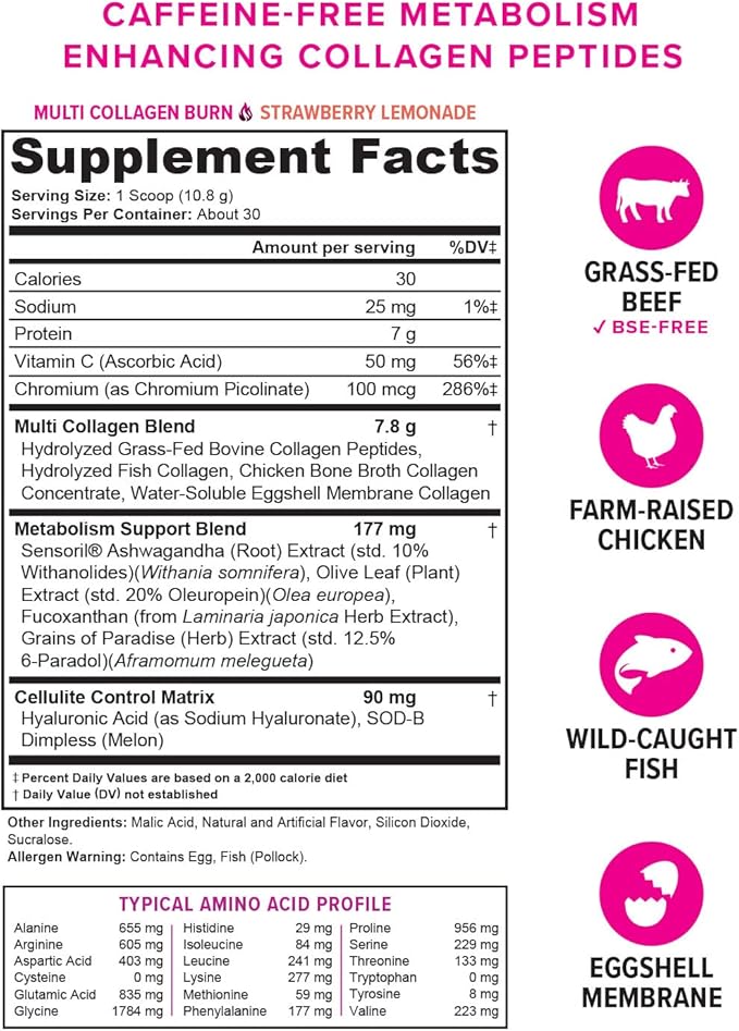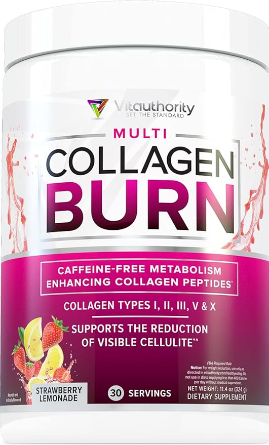 Multi Collagen Burn: Multi-Type Hydrolyzed Collagen Protein Peptides with Hyaluronic Acid, Vitamin C, SOD B Dimpless, Types I, II, III, V and X Collagen, Caffeine-Free (Strawberry Lemonade)