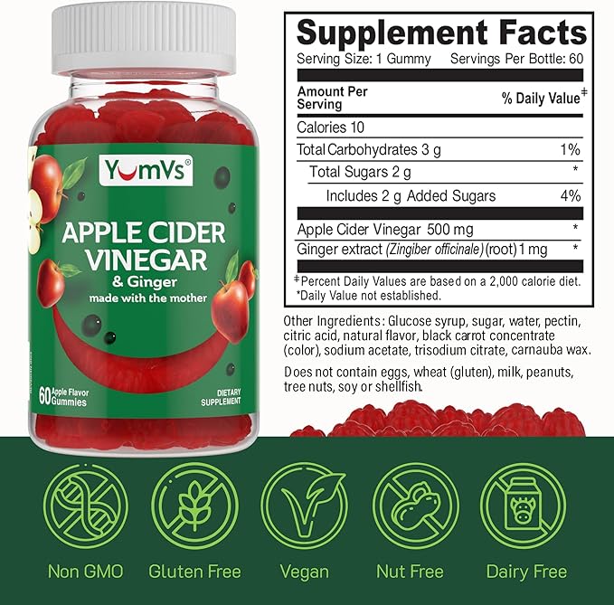 - DIGESTIVE COMFORT & BALANCE - These apple cider vinegar gummies (with the mother) are infused with natural ACV, known for promoting digestive balance and comfort. Paired with ginger for stomach health, these gummies are a flavorful way to address appetite and digestion.