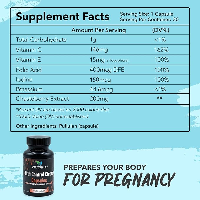 Birth Control Cleanse, Fertility Support & Hormone Balance for Women with Folic Acid, Vitamin C, Vitamin E, Iodine, Potassium, and Chasteberry Extract, 30 Capsules