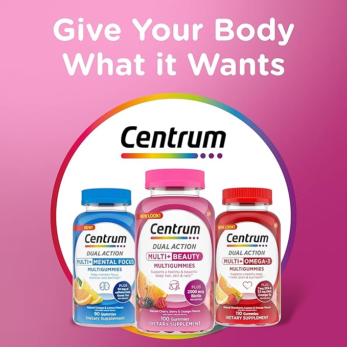 Centrum MultiGummies Multi+ Beauty Dual Action Multivitamin, Specially Designed with Biotin for Healthy Hair, Skin and Nails, Cherry/Berry/Orange Flavors - 100 Count