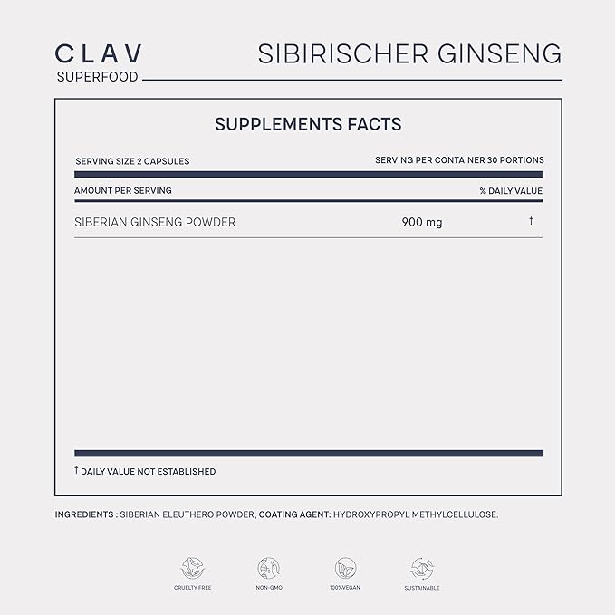 CLAV® Siberian Ginseng - 900mg Eleuthero Root Powder - Energy Supplement - Reduction of Tiredness & Fatigue - 60 Ginseng Capsules - Made in Germany