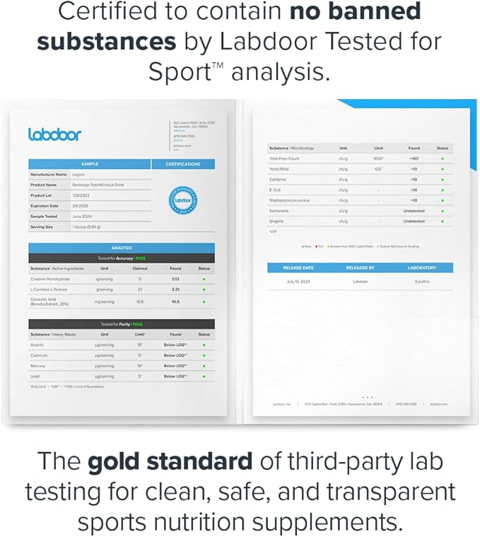 - Tested for purity and potency in an ISO 17025 accredited third-party lab, and independently certified to contain no contaminants or banned substances by Labdoor. Every bottle of our Recharge workout supplement for men and women is guaranteed to provide exactly what the label claims and nothing else.