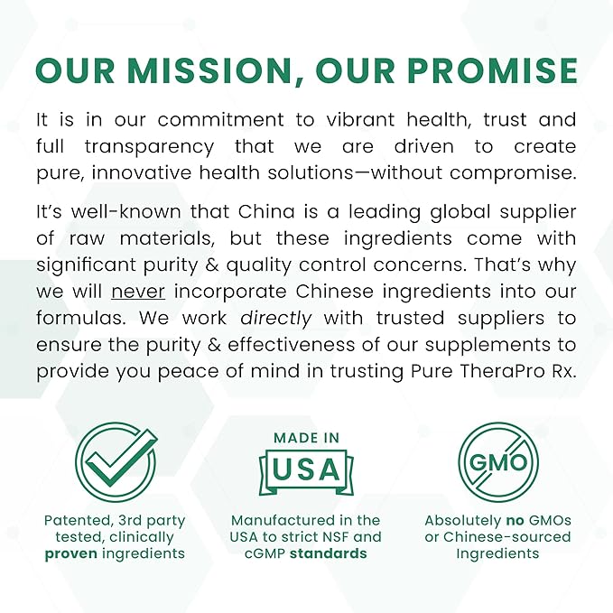 - ABOUT US: Pure TheraPro Rx was founded in Denver Colorado to formulate and manufacture the highest quality supplements available on the market today. Purity is our priority, which is why we insist on using patented, clinically studied ingredients, and never utilizing fillers, flow agents, excipients, or ingredients sourced from China. We also never use dairy, gluten, corn, soy, or other common allergens in any of our class-leading, practitioner-recommended formulas.