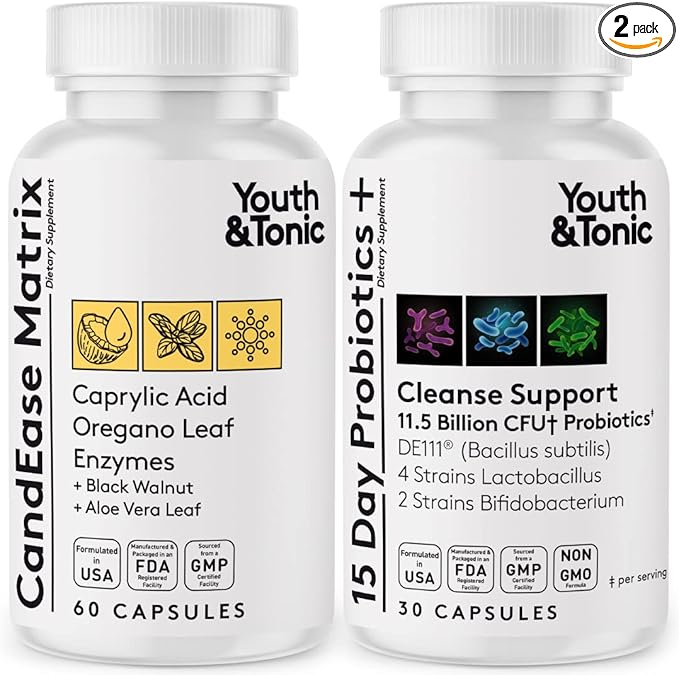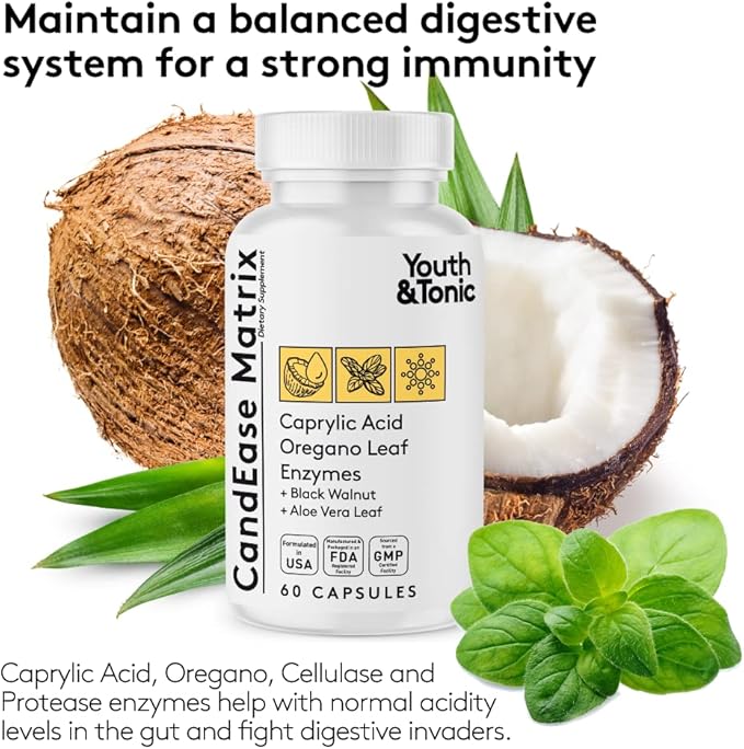 - Extra Strength CandEase Formula: Our advanced oral supplement combines high levels of oregano leaf extract and caprylic acid with complementary herbs like aloe vera, reishi mushroom extract, black walnut, wormwood, and enzymes to support normal acidity levels and overall gut health