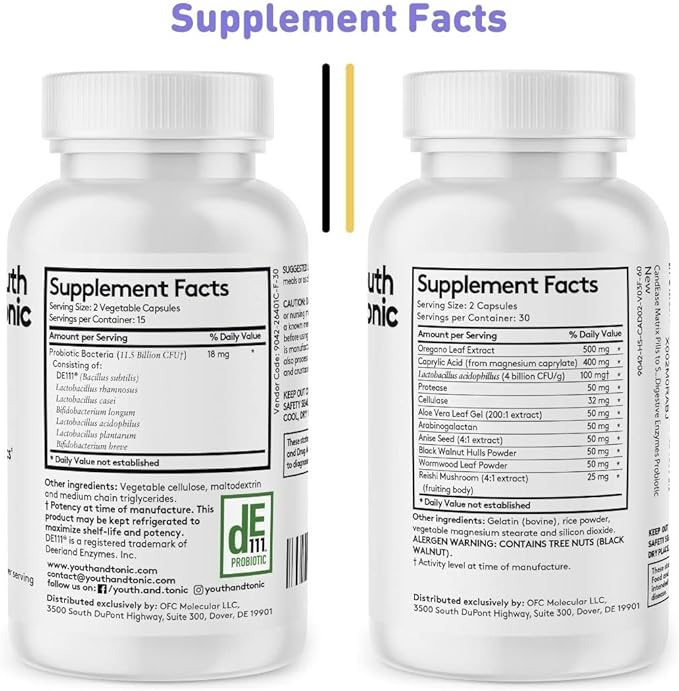 - Special Ingredients : DE111 patented probiotic, Caprylic Acid, Oregano