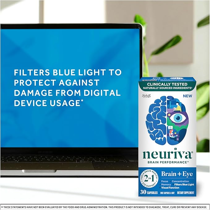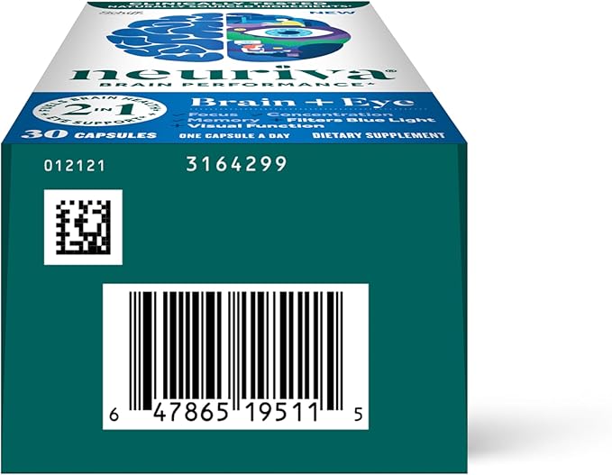 NEURIVA Brain + Eye Supplement for Memory, Focus & Concentration with Lutein & Vitamins A C E and Zinc for Eye Health & Zeaxanthin to Filter Blue Light, 30ct Capsules