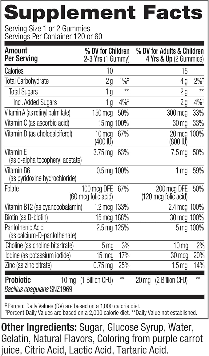 - HOW TO TAKE: Kiddos 2-3 years, chew one kids multivitamin gummy with probiotics daily. 4 years and up, chew two gummies daily.