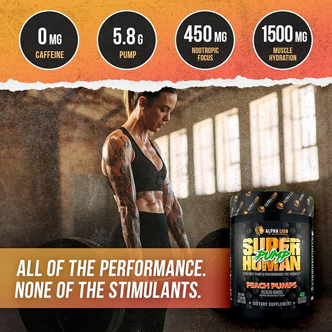 ALPHA LION Superhuman Pump Pre Workout Powder, Nootropic Caffeine & Stim Free Preworkout Supplement, Nitric Oxide Booster, Muscle Gainer, Energy & Focus (42 Servings, Peach Pumps Flavor)