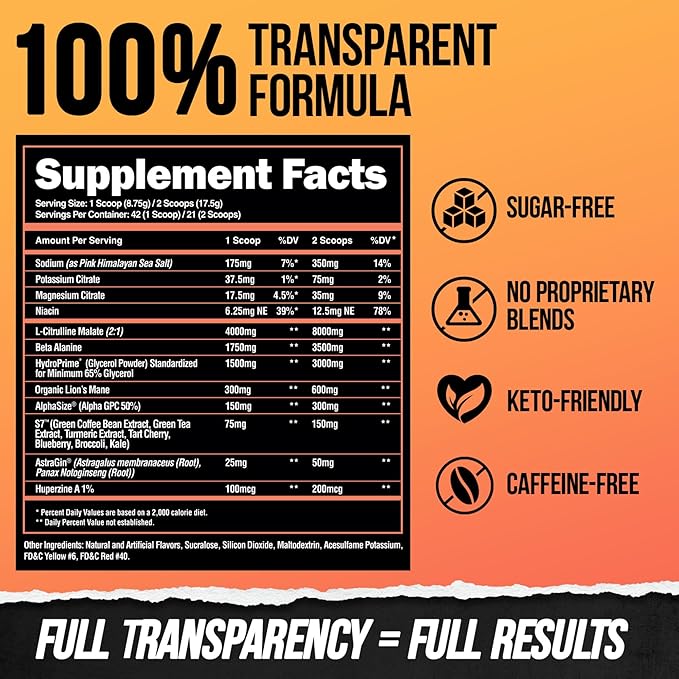 - NOOTROPIC PRE WORKOUT: Pump pre workout powder contains organic lion's mane and AlphaSize to help provide a dialed in nootropic energy and focus without the caffeine and stims.
