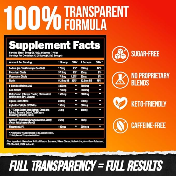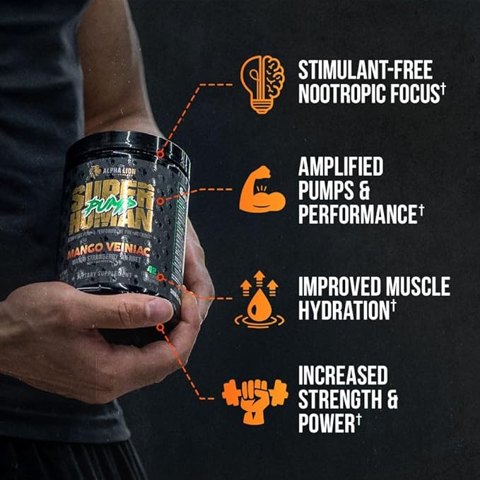- NOOTROPIC PRE WORKOUT: Superhuman Pump pre workout powder contains organic lion's mane and AlphaSize to help provide a dialed in nootropic energy and focus without the caffeine and stims.