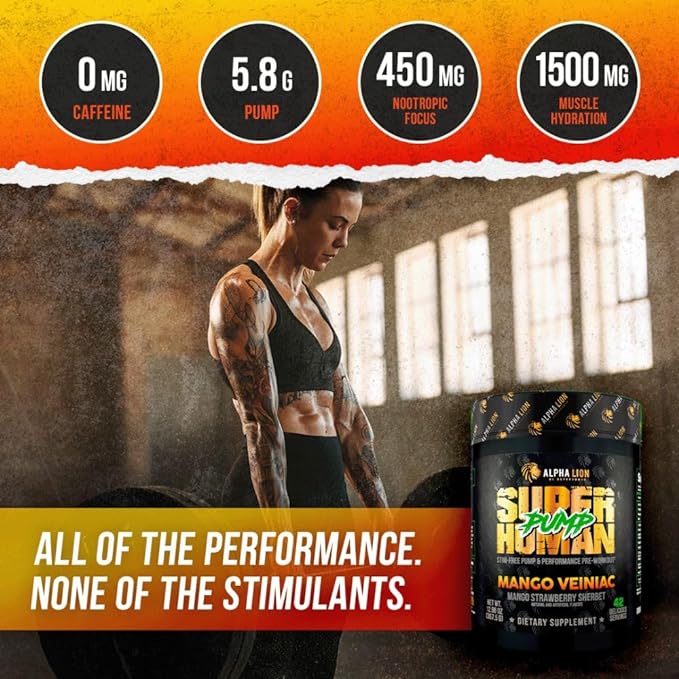 ALPHA LION Superhuman Pump Pre Workout Powder, Nootropic Caffeine & Stim Free Preworkout Supplement, Nitric Oxide Booster, Muscle Gainer, Energy & Focus (42 Servings, Mango Veiniac Flavor)