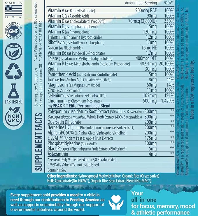 - Peak Quality Standards - Unlike regular vegan vitamins, our men and women's multivitamins are packed with gold-standard ingredients like SerinAid Phosphatidylserine and ElevATP ancient peat apple polyphenol extract. Nu-flow and Nu-mag are natural alternatives to toxic stearate flow agents found in low quality supplements. Always vegetarian-friendly, myPEAK products are produced in a state-of-the-art facility in the USA and lab-checked for purity and potency.