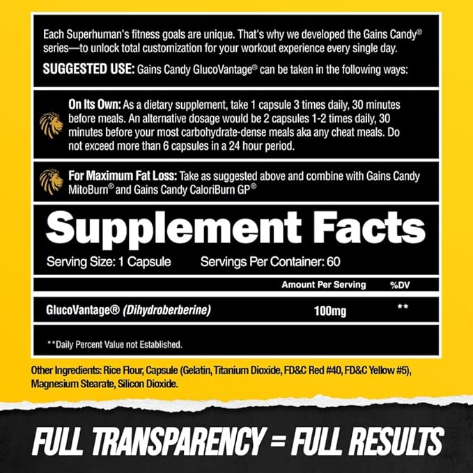 - GLUCOVANTAGE: GlucoVantage is the industry's first implementation of Dihydroberberine (DHB), an ingredient used in Eastern tradition that's known for its ability to inhibit fat cell growth. Our Gains Candy GlucoVantage will help support fat loss to help you reach your body and fitness goals.