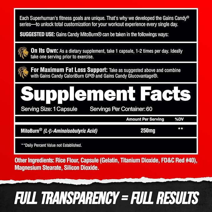 - MITOBURN: The ONLY ingredient in our Gains Candy MitoBurn diet capsules is a SCIENTIFIC DOSE of MitoBurn, the first verified and trusted form of L-BAIBA (an amino acid found in both plants and animals). This revolutionary new ingredient will become your best friend for incinerating unwanted fat.
