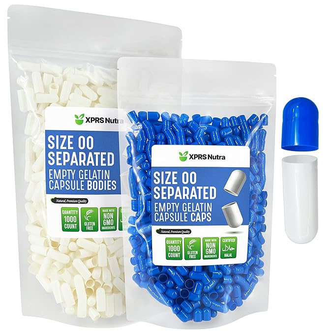 XPRS Nutra Size 00 Separated Capsules - 1000 Count Gelatin Empty Capsules Separated in Bags - Empty Capsules- Separated Empty 00 Capsules- Pill Capsules Empty for DIY Supplement Filling (Blue/White)