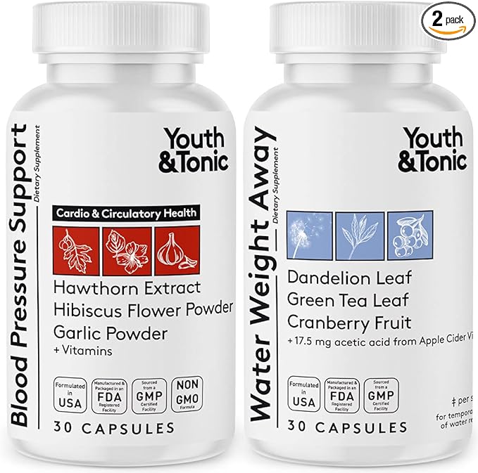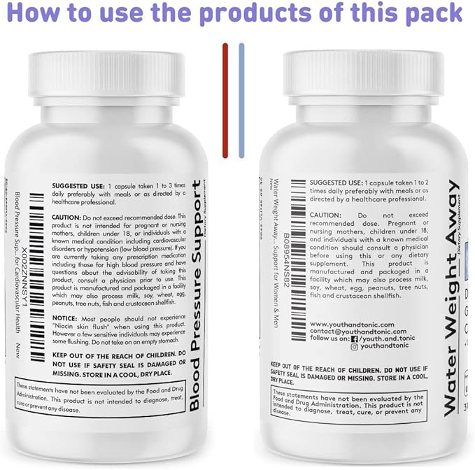 - [ USE TOGETHER ]: This pack contains 2 products, water weight away and blood pressure support supplements | Formulated and produced in USA in a registered and inspected facility following all GMP standards | If tried out our Water Away formula, had good results and want to continue purchasing it, better look for a more economic version of 60 or 90 capsules | Check our Amazon store