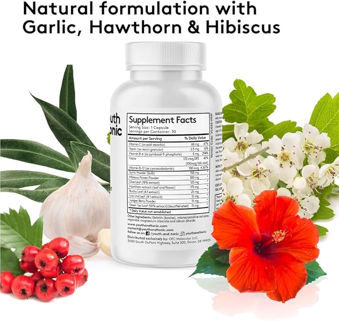 - [ BP SUPPORT ]: Herbal formulation with HAWTHORN HIBISCUS and GARLIC and 10 other potent premium vitamins, herbs & extracts to maintain a healthy circulatory system | Vitamin C, Niacin, Vitamin B-6, Folic Acid, Vitamin B-12, Olive Leaf, Buchu Leaf, Uva Ursi Leaf, Juniper Berry Powder, and Green Tea Leaf