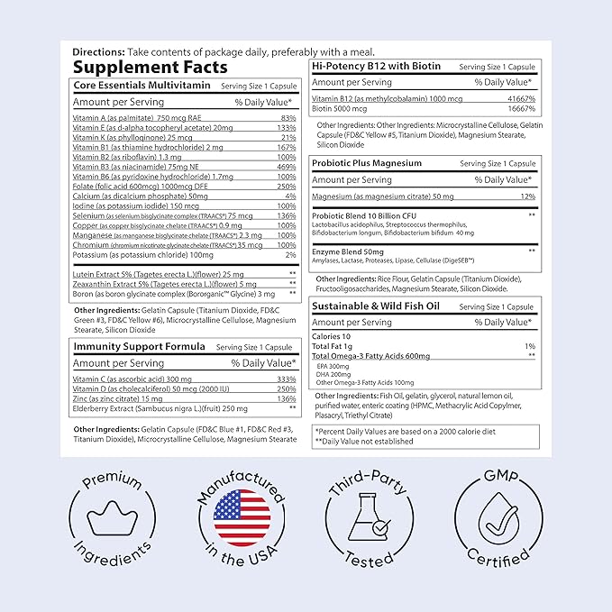 - 5 Capsules in each Daily Vitamin Pack. Our supplement packs include the following: Core Essentials Multivitamin, Sustainable & Wild Omega-3 Fish Oil, Hi-Potency Vitamin B-12 with Biotin, Immunity Support Formula, Probiotics Plus Magnesium