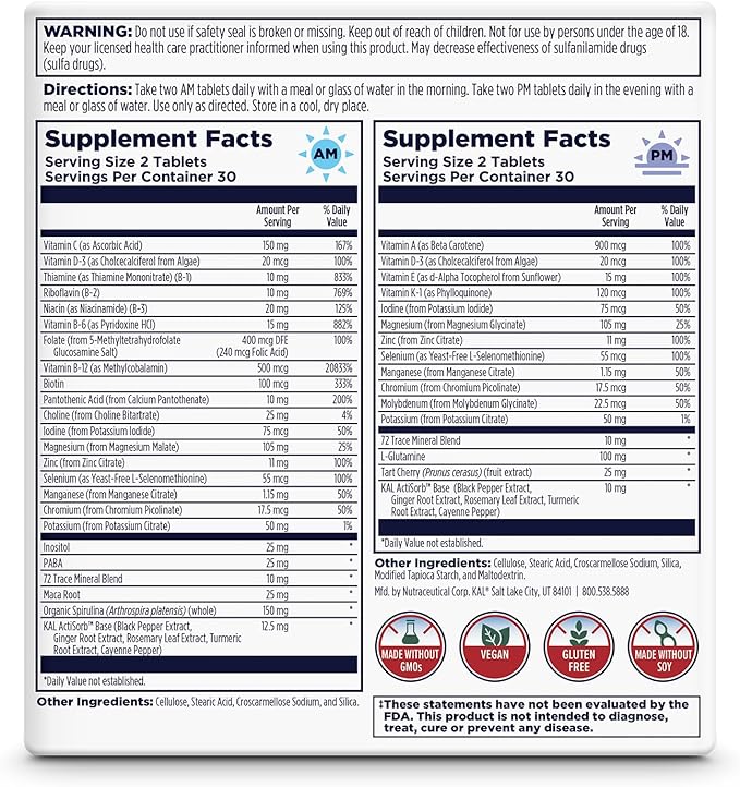 KAL Men's Multivitamin AM/PM, Antioxidants Supplement, Muscle, Immune, Electrolyte Balance, Overall Wellness Support, Made Without GMOs and Soy, Vegan, 30 Servings, 120 Tablets